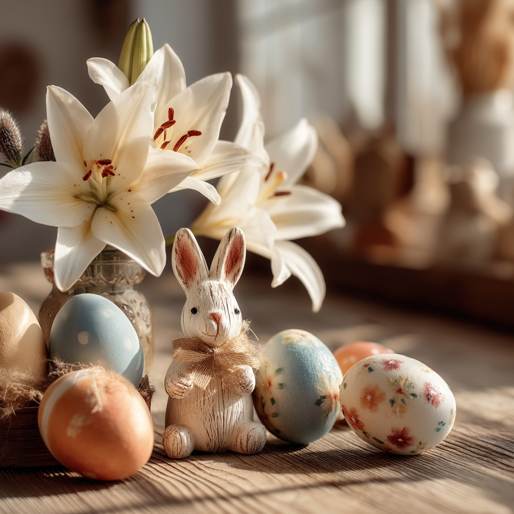 부활절 달걀, 토끼, 백합화 등 다양한 상징물들은 각각 새로운 생명과 희망을 의미합니다.